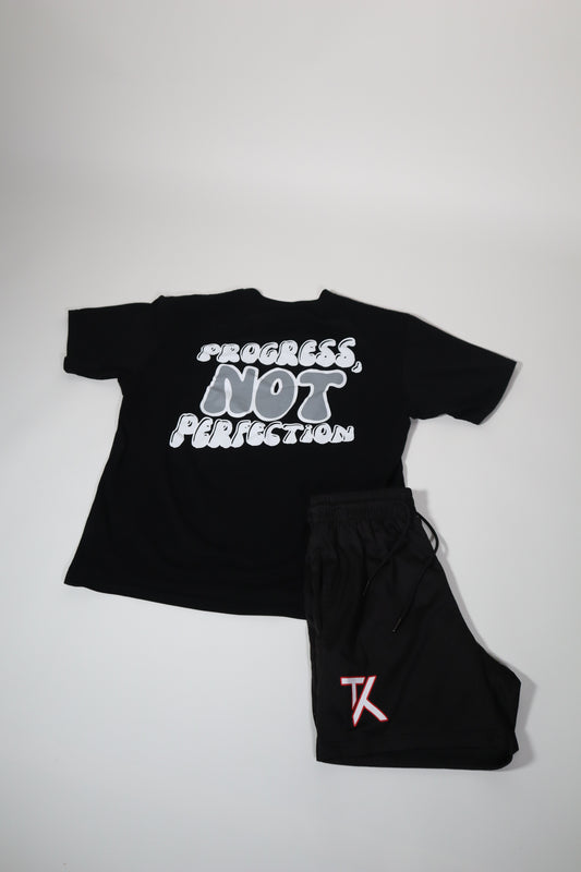 Featuring a bold 'Progress, Not Perfection' statement on the back, this tee combines comfort with a powerful message. Perfect for those who value the journey over the destination.